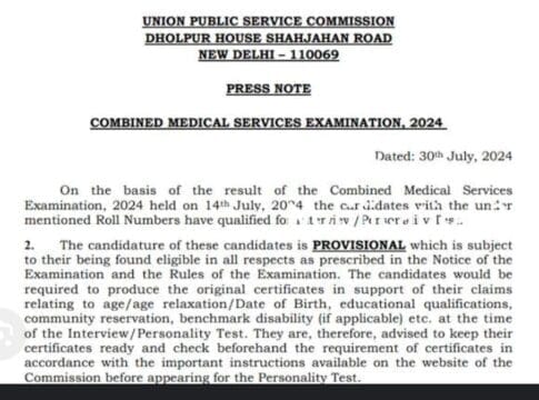 PARPANCH NEWS: संघ लोक सेवा आयोग (यूपीएससी) ने संयुक्त चिकित्सा सेवा (CMS)-2024 का अंतिम परिणाम घोषित कर दिया है। यूपीएससी ने एक आधिकारिक प्रेस विज्ञप्ति जारी कर कहा कि सम्मिलित चिकित्सा सेवा परीक्षा, 2024 की लिखित परीक्षा (भाग-I) तथा उसके बाद सितम्बर से नवम्बर, 2024 तक आयोजित व्यक्तित्व परीक्षण (भाग-II) के परिणाम के आधार पर अंतिम परिणाम तैयार किए गए हैं।
