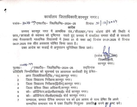 जिला अधिकारी ने आदेशित किया  कि अत्यधिक ठंड/शीतलहर/घना कोहरा होने की स्थिति में छात्र/छात्राओ के स्वास्थ्य को दृष्टिगत रखते हुए जनपद में संचालित समस्त बोर्डो के सरकारी तथा गैरसरकारी माध्यमिक विद्यालयों में (कक्षा 01 से कक्षा 08) दिनांक 01.01.2025 से दिनांक 04.01.2025 तक  बंद रहेंगे।