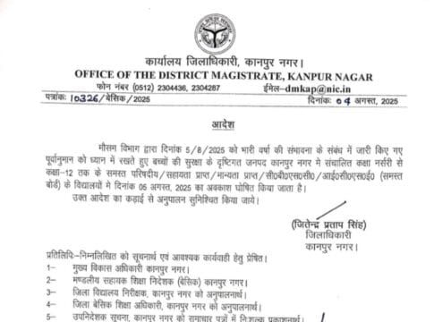 Kanpur । मौसम विभाग द्वारा 5 अगस्त 2025 को भारी वर्षा की चेतावनी जारी किए जाने के बाद जिलाधिकारी महोदय ने एहतियातन एक महत्वपूर्ण निर्णय लिया है। बच्चों की सुरक्षा को प्राथमिकता देते हुए जनपद कानपुर नगर में संचालित कक्षा नर्सरी से 12वीं तक के सभी स्कूलों में मंगलवार, 5 अगस्त को अवकाश घोषित किया गया है।