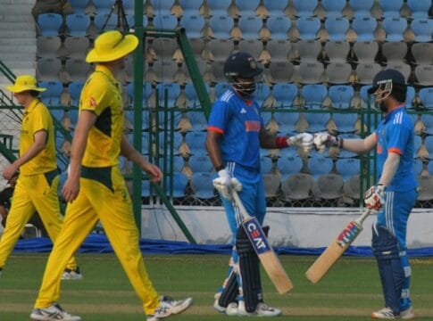 इसके अगली गेंद पर विल सदरलैंड ने नए बल्लेबाज सूर्यांश सेघड़े को भी बिना खाता खोले पवेलियन. की राह दिखायी। रवि विश्नोई ने नाबाद एक रन बनाते हुए टीम को 50 ओवर में छह विकेट पर 413 रनों के विशाल स्कोर तक पहुंचाया। आस्ट्रेलिया ए की तऱफ से विल सदरलैंड ने दो, टॉम स्ट्राकर, लियाम स्कॉट, टॉड मर्फी और तनवीर सांघा ने एक-एक विकेट लिया