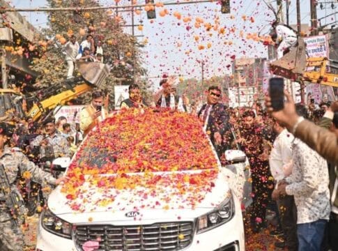 जेसीबी से पुष्प वर्षा, ढोल-नगाड़ों और नारों से गूंजा शहर, कार्यकर्ताओं ने दिखाई एकजुटता, झंडों की अनदेखी बनी चर्चा का विषय