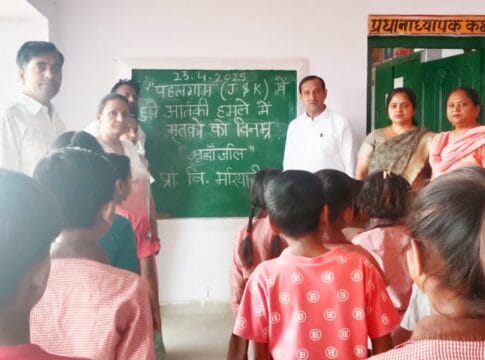 Kanpur । पहलगाम में आतंकियों द्वारा मारे गए मृतकों की आत्मा शांति के लिए चौबेपुर स्थित प्राथमिक विद्यालय मारियानी में शिक्षकों और बच्चों ने दो मिनट का मौन धारण कर श्रद्धांजलि दी गई।