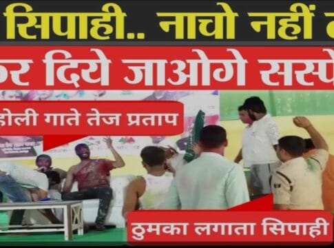 Patna । पटना में होली के मौके पर लालू के बड़े लाल तेज प्रताप का एक वीडियो वायरल हो रहा है। जिसमें वो एक सिपाही को गाने पर नाचने के लिए कह रहे हैं। साथ ही चेतावनी दे रहे हैं कि अगर तुमने आज ठुमका नहीं लगाया तो सस्पेंड कर दिए जाओगे।